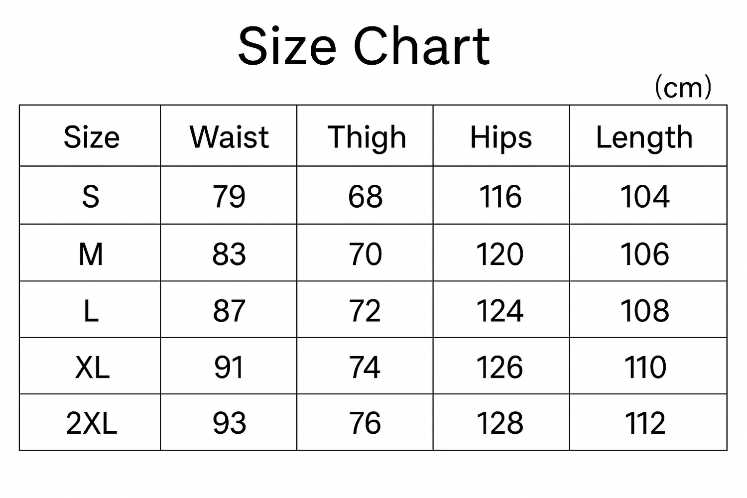 | Taille | Tour de taille | Tour de cuisse | Tour de hanches | Longueur |
