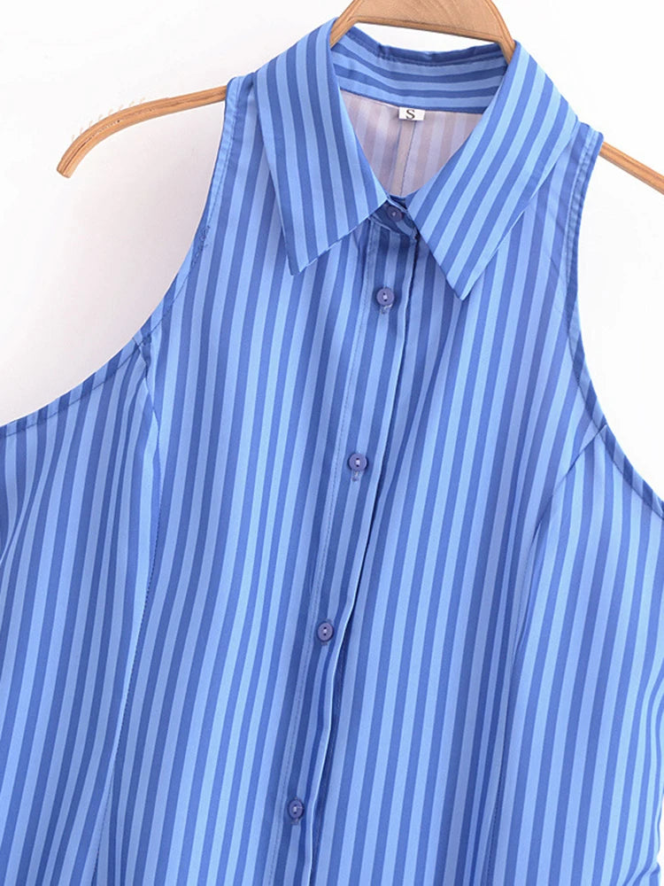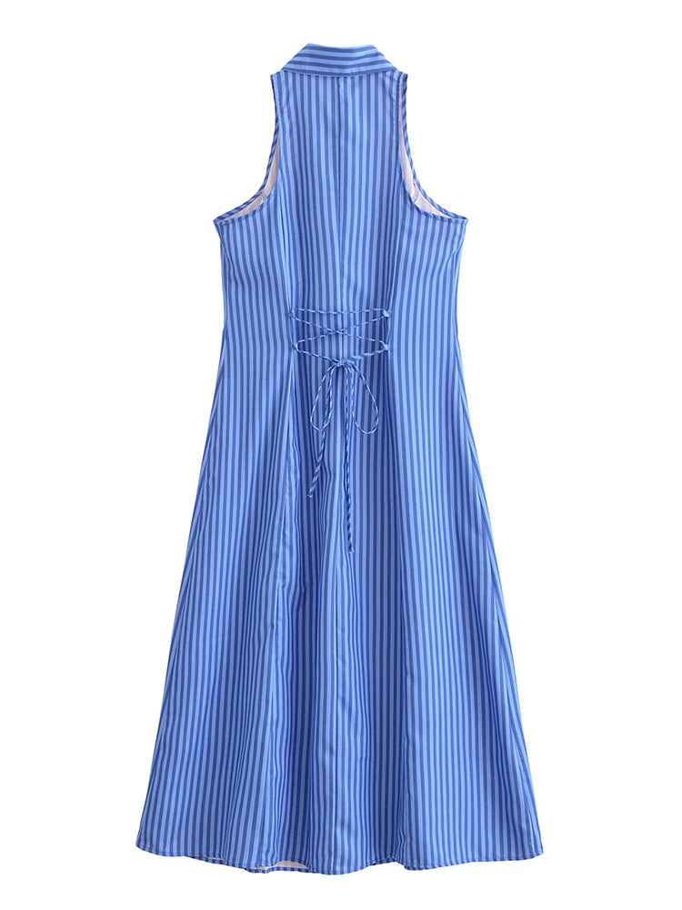 The blue and white striped pattern is both stylish and timeless, giving the dress a fresh and modern look that can easily be paired with various accessories.