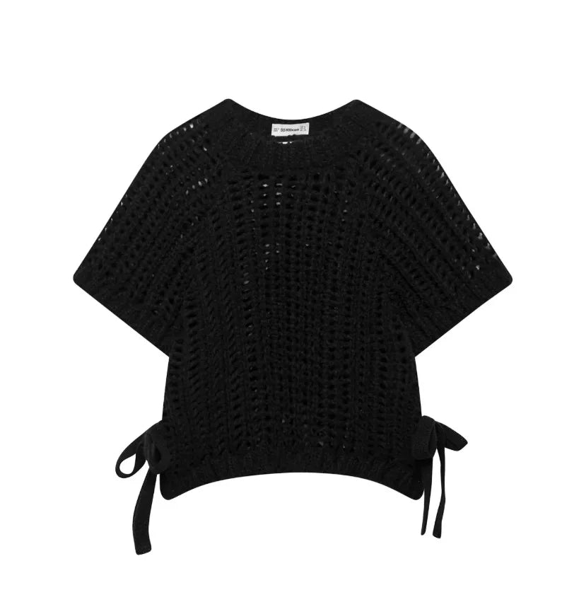 This moto-inspired pullover features a ruffled collar, puff sleeves, and a bold geometric pattern. Made from high-stretch acetate, it's the perfect mix of comfort and edge for the autumn/winter season.